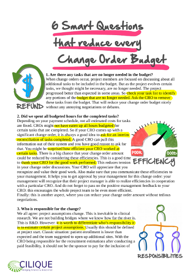 Can you imagine going to your management and announcing that there has been a 7-digit change order request from the CRO, but then being able to tell them that after several negotiation rounds the project costs did not increase? That is what we achieved to this extent only once but zero amount change orders or even overall cost reductions are not uncommon in our experience. The importance is to negotiate about efficiencies where quality and patient safety is not affected.